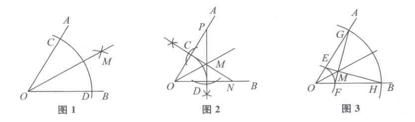 ② 分别以点 C、D 为圆心,大于$\frac{1}{2}$CD 的长为半径作弧,两弧在∠AOB 内部交于点 M;