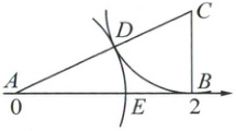 (2)由形到数:如图,在数轴上,点$A$、$B$表示的数分别为$0$、$2$。作$BC\perp AB$于点$B$,截取$BC = 1$;连接$AC$,以点$C$为圆心,$CB$长为半径画弧,交$AC$于点$D$;以点$A$为圆心,$AD$长为半径画弧,交$AB$于点$E$,则点$E$表示的实数是
