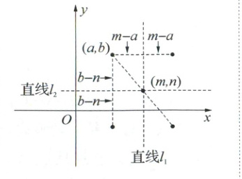 例 探究:在平面直角坐标系中,令直线$l_{1}$为过点$(m,0)$且平行于$y$轴的直线,直线$l_{2}$为过点$(0,n)$且平行于$x$轴的直线,则点$(a,b)$关于直线$l_{1}$的对称点坐标是