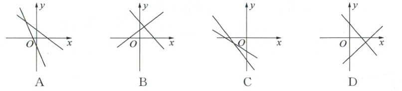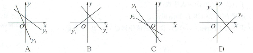 D 选项,由 $ y_1 $ 得 $ a < 0 $,$ b > 0 $,由 $ y_2 $ 得 $ a < 0 $,$ b > 0 $,且由图得两直线的交点在第四象限,一致.