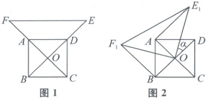 1. 如图 1,$O$ 为正方形 $ABCD$ 的中心,分别延长 $OA$、$OD$ 到点 $F$、$E$,使 $OF = 2OA$,$OE = 2OD$,连接 $EF$。将 $\triangle EOF$ 绕点 $O$ 逆时针旋转 $\alpha$ 角得到 $\triangle E_{1}OF_{1}$(如图 2)。探究 $AE_{1}$ 与 $BF_{1}$ 的数量关系,并给予证明。