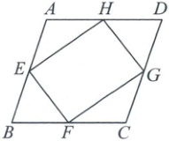 1. 如图,在四边形 $ABCD$ 中,点 $E$、$F$、$G$、$H$ 分别是各边的中点,且 $AB // CD$,$AD // BC$,四边形 $EFGH$ 是矩形。