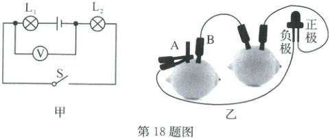 18. 如图甲所示电路,电源电压恒为 3 V,闭合开关 S 后,电压表的示数为 1 V,则灯 L₂ 两端的电压为