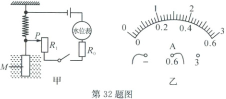 32. (7 分)如图甲所示是一种家庭水箱水位测量装置示意图,电源电压 6 V 保持不变,R₀ 是阻值为 10 Ω 的定值电阻,R₁ 是长 20 cm、阻值为 20 Ω 的电阻丝,滑片 P 把电阻丝 R₁ 与轻质弹簧的指针连在一起,在浮子 M 的作用下可上下移动。当滑片 P 在 R₁ 的最上端时,水位恰好处于最高处;当滑片 P 在 R₁ 的最下端时,水位恰好处于最低处。(轻质弹簧阻值不计)