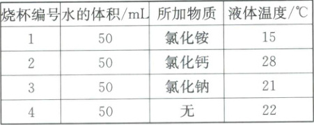 过程:取 4 只烧杯,各加入 50 mL 的水,在其中 3 只烧杯中分别加入 1 药匙的氯化铵、氯化钙、氯化钠,溶解后测量液体温度,记录数据如下表。