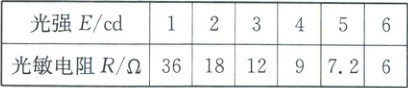 (2)如图是某同学利用光敏电阻设计的“汽车远、近光灯的自动控制”模拟电路图。汽车远、近光灯电控转换器 K 相当于电压表。闭合开关 S,当光强 E≥3 cd 的光照到光敏电阻时,远光灯能自动切换为近光灯。已知电源电压恒为 6 V,R₀=6 Ω,光敏电阻的阻值 R 随光强 E 变化的关系如下表。(5 分)