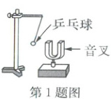 1. 如图所示,将悬挂的乒乓球轻轻接触正在发声的音叉,观察到乒乓球被音叉多次弹开;声音消失,乒乓球也停止运动。此现象表明声音(