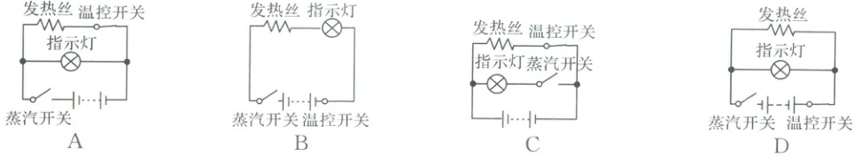 10.D 解析:由题意可知,指示灯与发热丝独立工作,是并联;闭合蒸汽开关,指示灯亮,发热丝开始加热,说明蒸汽开关在干路上;当蒸汽开关故障无法自动断开时,处于常闭状态的温控开关会在水烧干时自动断开使水壶停止加热,说明温控开关也在干路上,故选项D符合题意。故选D。