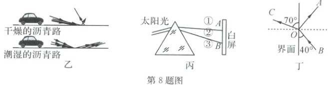 B.图乙中干燥的沥青路面是漫反射,潮湿的沥青路面是镜面反射