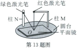 13. (6 分)在探究光的反射定律实验中,小金首先将平面镜放在水平桌面上,进行了如下演示。先用加湿器使整个教室充满雾气,将平面镜放在一个能转动的水平圆台上,在柱 M 上固定一个红色激光笔, ①,表示出法线,然后打开固定在柱 N 上的绿色激光笔,使绿色激光射向 O 点,出现了如图所示的情景。
