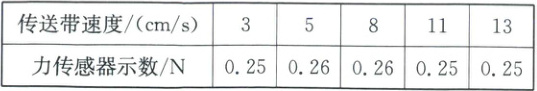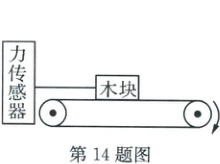 14. (6 分)为了探究“滑动摩擦力的大小与运动速度大小的关系”,小明用如图所示的装置进行实验,其中力传感器可以显示对木块拉力的大小,从而得到木块受到的滑动摩擦力的大小。实验时使木块保持静止不动,而传送带匀速运动,以实现木块相对于传送带向左运动。实验数据如下表。