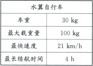 (2)水翼自行车说明书中的部分参数如表所示。请通过计算求出空载状态下,水翼自行车漂浮在水面时排开水的体积。(水的密度取 $ 1.0 × 10^3 $ kg/m³)(3 分)