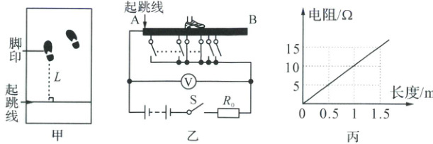 立定跳远的距离是指身体落地时离起跳线最近的点到起跳线的垂直距离,如图甲所示。小组同学设计了如图乙所示的电路原理图,其中电源电压恒为 3 V,定值电阻 $ R_0 $ 的阻值为 10 Ω,AB 是长度为 3 m 的均匀电阻丝,其阻值与长度的关系如图丙所示。设定 A 为起跳线位置,电阻丝上每隔 1 cm 设置一个压力开关,当压力开关受到一定压力时会自动闭合(图乙中“…”处部分开关未画出)。
