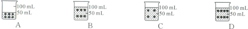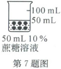 7. 建立模型是解决问题的一种方法。右图是 50 mL、10%的蔗糖溶液,其中“●”表示所含的蔗糖分子。在该溶液中加入一定量的水,使它成为 5%的蔗糖溶液。能表示稀释后蔗糖溶液模型的是(