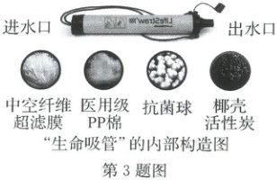 3. “生命吸管”可以解决野外极限环境中的饮水问题。如图所示,“生命吸管”中没有用到的净水方法是(
