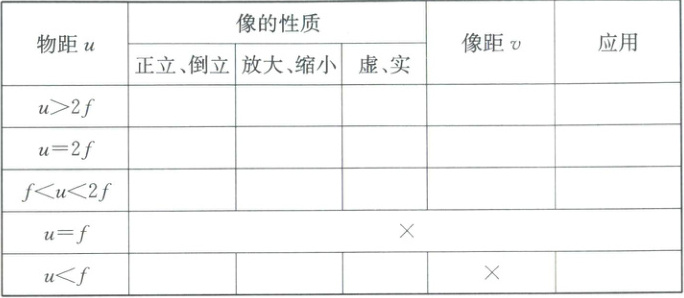 | | $u=2f$ | 倒立 等大 | 实 | $v=2f$ | 测焦距 |