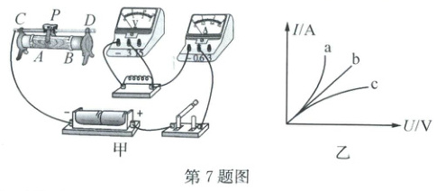 所示。已知小灯泡的电阻会随温度的升高而变大,将电阻换成小灯泡重复该实验,其I-U图像如图乙中c