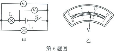 6. (2025·松阳)如图甲所示电路中,灯L₁和L₂的连接方式为_______。电压表V₂测量的是_______(填“L₁”“L₂”或“L₁和L₂”)的电压。当闭合开关后,两只电压表的指针偏转均如图乙所示,灯L₁两端的电压为_______伏。