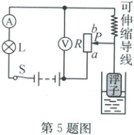 5. (2025·杭州余杭、萧山)如图,某科技小组设计的水位计工作原理图,绝缘浮子随水位的升降带动滑动变阻器R的金属滑杆P升降,水位最低时,滑杆P位于R的a端处,L是一个指示灯,电路各部分接触良好,不计导线电阻,下列说法正确的是()