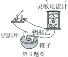 6. (2025·东阳)用导线将开关、灵敏电流计和材质不同的钥匙甲、乙相连,将两钥匙插入橙子中(如图)。闭合开关,灵敏电流计指针发生偏转。下列推测一定正确的是(