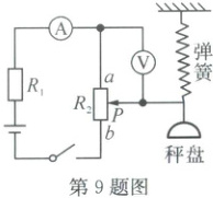 9. (2025·缙云)某项目化小组制作了一个利用电表测物体重力的小作品,其原理图如图所示。当秤盘上不放任何重物时,滑片$P$恰好处于$a$点。闭合开关,当秤盘上所放钩码个数增多时,电流表示数和电压表示数的变化情况是(