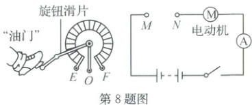 8. (2025·松阳)电动汽车利用旋钮变阻器实现对转速的控制,车速仪由电路中的电流表改装而成,图中$O$、$E$、$F$为变阻器的三个接线柱。驾驶员踩下“油门”,旋钮滑片逆时针转动,车速仪示数变大。则与$M$、$N$相连接的是(