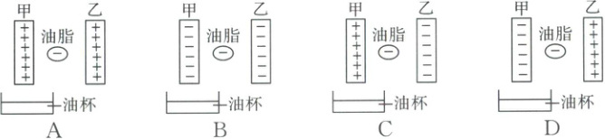 7. (2025·杭州钱塘)静电分离是让甲、乙两金属板和油脂液滴分别带上电荷,当烟雾由下往上从两金属板间通过时,空气和水汽由于不带电顺利通过,而带负电的油脂液滴会被一侧的金属板吸附,并在重力作用下流入其下方的油杯。下列图中金属板所带电荷及油杯位置符合要求的是(