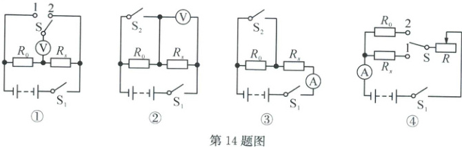 14. (2025·绍兴柯桥)如图是小科利用实验室常用仪器,设计测量未知电阻$R_{x}$阻值的四种电路,电源电压恒定且未知,$R_{0}$是已知阻值的定值电阻,滑动变阻器$R$最大阻值未知,实验中只能闭合或断开开关及移动滑动变阻器滑片,其中能够测量出$R_{x}$阻值的电路是(