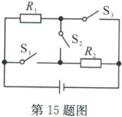 15. (2025·新昌)学校项目化学习小组设计了一款颈部热敷仪,其工作电路如图所示。已知$R_{1}>R_{2}$,当电源电压一定时,电路中总电阻越小(不能为$0$),总电流越大,则温度越高。有关该款热敷仪的说法正确的是(