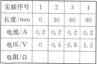。(6分)【定量研究】为了探究铅笔芯电阻大小与长度的定量关系,小科设计了如图乙所示的电路图,闭合开关后,先移动滑片$P_{2}$至合适的位置,读出电流表示数,再移动滑片$P_{1}$,用刻度尺测出$MP_{1}$的长度,读出此时电压表示数,实验数据如表所示。