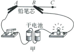 【定性研究】小科利用铅笔芯,先将左侧金属夹的位置固定在$A$点,右侧金属夹分别连接在铅笔芯上的$B$、$C$两处(已知$B$为$AC$的中点),开展了“探究铅笔芯电阻大小与其长度关系”的实验(如图甲所示)。