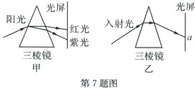7. (2025·奉化、象山、宁海)如图甲所示,阳光经三棱镜折射后发生色散现象。如图乙,当一束红光经三棱镜折射后,在光屏上a点处形成一个红色光斑。现保持入射光位置、方向及三棱镜位置不变,仅将红光改为紫光,以下说法正确的是(