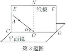 8. (2025·天台)如图是探究“光的反射定律”的实验,平面镜水平放置,白色纸板竖立在镜面上,在纸板上安装一支可在纸板平面内自由移动的激光笔,入射光线AO紧贴纸板射向镜面,纸板上能看到反射光线OB(图中未画出),O为入射点,ON为法线,则下列说法正确的是(
