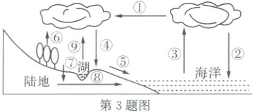 3. (2025·缙云)2024年第14号台风“普拉桑”于9月19日在浙江省岱山登陆,登陆时中心附近最大风力10级。“台风过境”属于水循环(如图)中的(