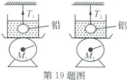 19. (2025·玉环)如图所示,两只完全相同的容器,盛上相同质量的水放在台秤上,用细线悬挂质量均为270g的实心铅球和铝球(ρ铅=11.34g/cm³,ρ铝=2.7g/cm³),两球全部没入水中,铝球所受的浮力为