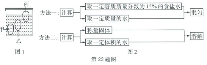 (填“甲”“乙”或“丙”)鸡蛋。(1分)(2)配制食盐水可用如图2所示的两种方法。小科现用方法一配制溶质质量分数为6%的食盐水1000g,需要取溶质质量分数为15%的食盐水多少克?需要加水多少克?(6分)