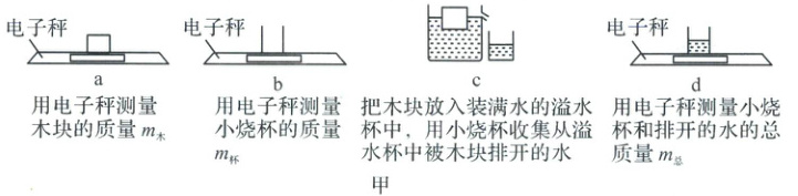 (3)小城认为以上实验过程可以更加简化,如图乙所示,只需将装满水的溢水杯放在电子秤上,将木块放入溢水杯的同时用手拿着小烧杯收集排开的水,等溢水杯中不再有水溢出时,拿走小烧杯,若观察到______,即可得到F浮=G排。