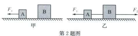2. (2025·新昌)在水平桌面上放置A、B两个物体。如图甲,A物体在水平拉力$F_{1}$的作用下向左做匀速直线运动;如图乙,A、B两个物体用轻绳水平连接,在水平拉力$F_{1}$、$F_{2}$的共同作用下一起向右做匀速直线运动。已知水平拉力$F_{1}=7N$、$F_{2}=25N$,下列说法正确的是(
