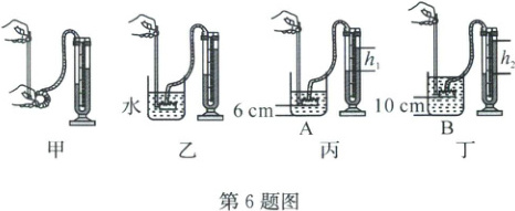 。(4)小金继续按下面步骤进行实验:①将压强计的金属盒放入A烧杯的水中,金属盒到烧杯底的距离$L$为6cm,如图丙所示,记录压强计U形管两侧的液面高度差$h_{1}$;②将压强计的金属盒放入B烧杯的水中,金属盒到烧杯底的距离$L$为10cm,如图丁所示,记录压强计U形管两侧的液面高度差$h_{2}$。实验后,小金发现$h_{1}<h_{2}$,于是小金得出结论“液体内部任意一点的压强与该点到容器底的距离$L$有关”。请你利用这些器材,设计一个实验证明小金的结论是错误的。请写出实验方案(可结合图进行说明)。