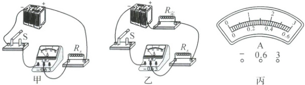 如图甲,将待测电阻、开关和电流表连在电压为 $ 6 \, V $ 的电源的两端。使用时发现当待测电阻过小时,会发生