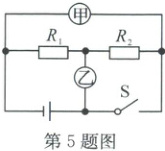 5. (2025·兰溪、浦江)如图所示,若甲、乙两表为电压表,当开关 $ S $ 闭合时,两个电压表的示数之比为 $ U_{甲}:U_{乙} = 4:1 $,则电阻 $ R_1:R_2 = $