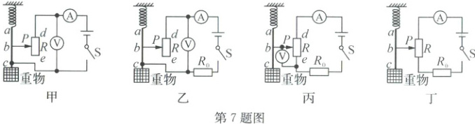 7. (2025·德清)小德与同学设计了三款电子称重计(如图甲、乙、丙),他们试图将电压表改装成称重计。其中电压表量程为 $ 0 \sim 3 \, V $,电流表量程为 $ 0 \sim 0.6 \, A $,定值电阻 $ R_0 = 5 \, \Omega $,电源电压恒为 $ 4 \, V $。$ R $ 是竖直放置的电阻,长 $ 9 \, cm $,总电阻为 $ 15 \, \Omega $,其接入电路的电阻与接入长度成正比。弹簧受到拉力作用时均匀伸长,且每受到 $ 5 \, N $ 拉力时弹簧长度伸长 $ 1 \, cm $。金属杆 $ ac $ 和 $ bP $(右端 $ P $ 是滑片,$ bP $ 随金属杆上下运动)与电路接触良好,电阻不计,未悬挂重物时 $ P $ 与 $ d $ 接触。