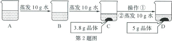 2. (2025·新昌)世界上 $70\%$的硝酸钾用于农业,饱和硝酸钾溶液还可用作消毒剂。现有 $T^{\circ}C$时 $100g$硝酸钾溶液,在此温度下发生的变化过程如下。