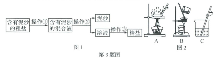 3. (2025·玉环)余姚是浙江省最重要的海盐生产区,其盐业生产历史已有 $1300$余年。余姚盐场的年产量长期位居全浙之冠,小玉取盐场中一小份粗盐进行了实验。