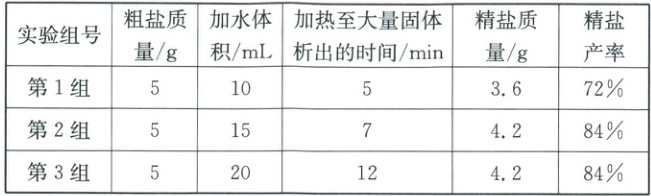 (3)小玉继续探究粗盐提纯时加入水的量对实验效率和精盐产率的影响,进行了三组实验。(注:三组实验操作均正确)