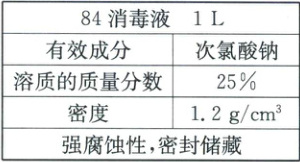 4.解:$(1)V=1L=1000cm³ m_{液}=ρV=1.2g/cm³×1000cm³=1200g=1.2kg m_{质}=m_{液}×25\%=1.2kg×25\%=0.3kg $答:该瓶84消毒液中次氯酸钠的质量是0.3千克。