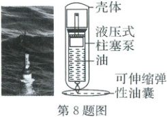 8. (2025·杭州余杭、萧山)浮标广泛应用于台风预测、海洋资源开发等领域。如图所示,浮标上部是封闭坚硬的壳体,壳体内部是液压式柱塞泵,柱塞泵内有油,壳体下部有可伸缩的弹性油囊,油囊自身的质量和体积忽略不计。柱塞泵下端与油囊连通,浮标可以通过液压式柱塞泵将泵内的油注入油囊或抽回泵内来实现浮沉。已知浮标壳体和柱塞泵的总质量为 $40kg$,油的总质量为 $20kg$,油的密度为 $0.8× 10^{3}kg/m^{3}$,海水密度取 $1.0× 10^{3}kg/m^{3}$。当柱塞泵向油囊中压入 $8kg$油时,浮标悬浮于水中。请计算: