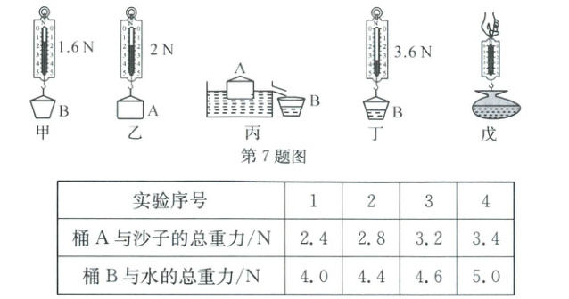 $N$。(3)测出桶 $B$和流出水的总重力,接着小玉往桶 $A$中加入沙子重复进行实验,观察到随着加入沙子越来越多,桶 $A$浸入水中的深度(桶 $A$没有被浸没)变深,得到 $4$组数据,表格如上,其中有明显错误的是第
