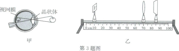 3. (2025·杭州滨江)如图甲所示是人眼的成像原理图。小滨对人眼既能看清远处,又能看清近处的原因进行了研究。他通过查阅资料得知:人眼的视网膜到晶状体中心的距离是不变的。于是他猜测人眼看远近不同的物体时,晶状体的焦距会变化。为验证猜想,小滨进行了以下实验。