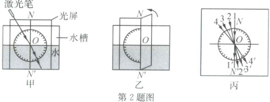 。(2)不断改变入射角,读出刻度盘上对应的折射角。将实验结果画在图丙中,1和1'、2和2'、3和3'、4和4'分别表示各次入射光线和对应的折射光线。根据图丙,可得出光从空气斜射入水中时的相关结论有: